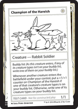 Whenever another creature enters the battlefield under your control, put a +1/+1 counter on Champion of the Hareish if one of that creature's creatue types is on your buddy list. Otherwise, write one of its creature types on your buddy list.