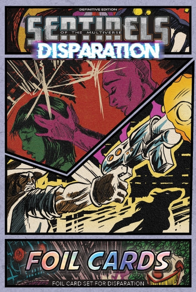 Elevate your Sentinels of the Multiverse experience with the Disparation Definitive Edition Foil Pack 3. This premium collection features 52 double-sided hero-sized cards and 27 double-sided villain-sized cards, all with stunning foil treatment. Each character card, variant, and event card shines with enhanced visual appeal, bringing the Multiverse to life with unprecedented brilliance. Essential for collectors and dedicated players seeking to maximize their gameplay aesthetic while maintaining full compatibility with the Disparation expansion.